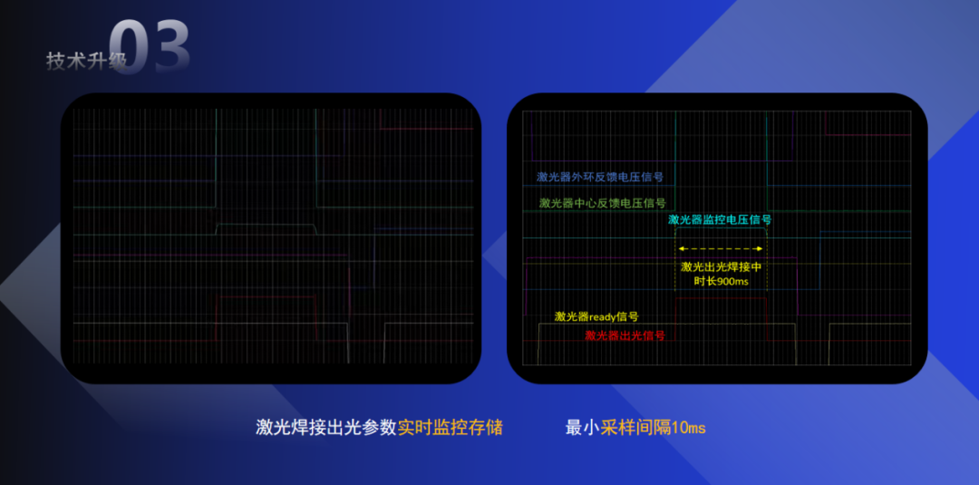 数字化实时监控:激光焊接参数可实时监控、可视化分析,最小采样间隔10ms,助力快速定位异常,实现工艺可追溯、良率可管控。