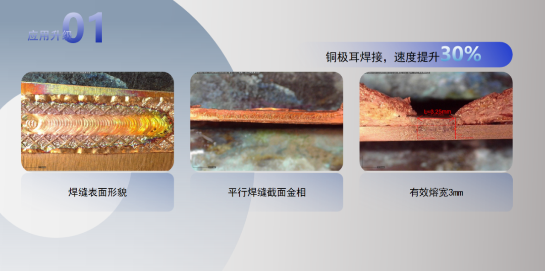 在铜极耳焊接中,相比RFL-3000/3000-SM-ABP-R速度提升高达30%,并获得3mm的有效熔宽,焊缝形貌完美。